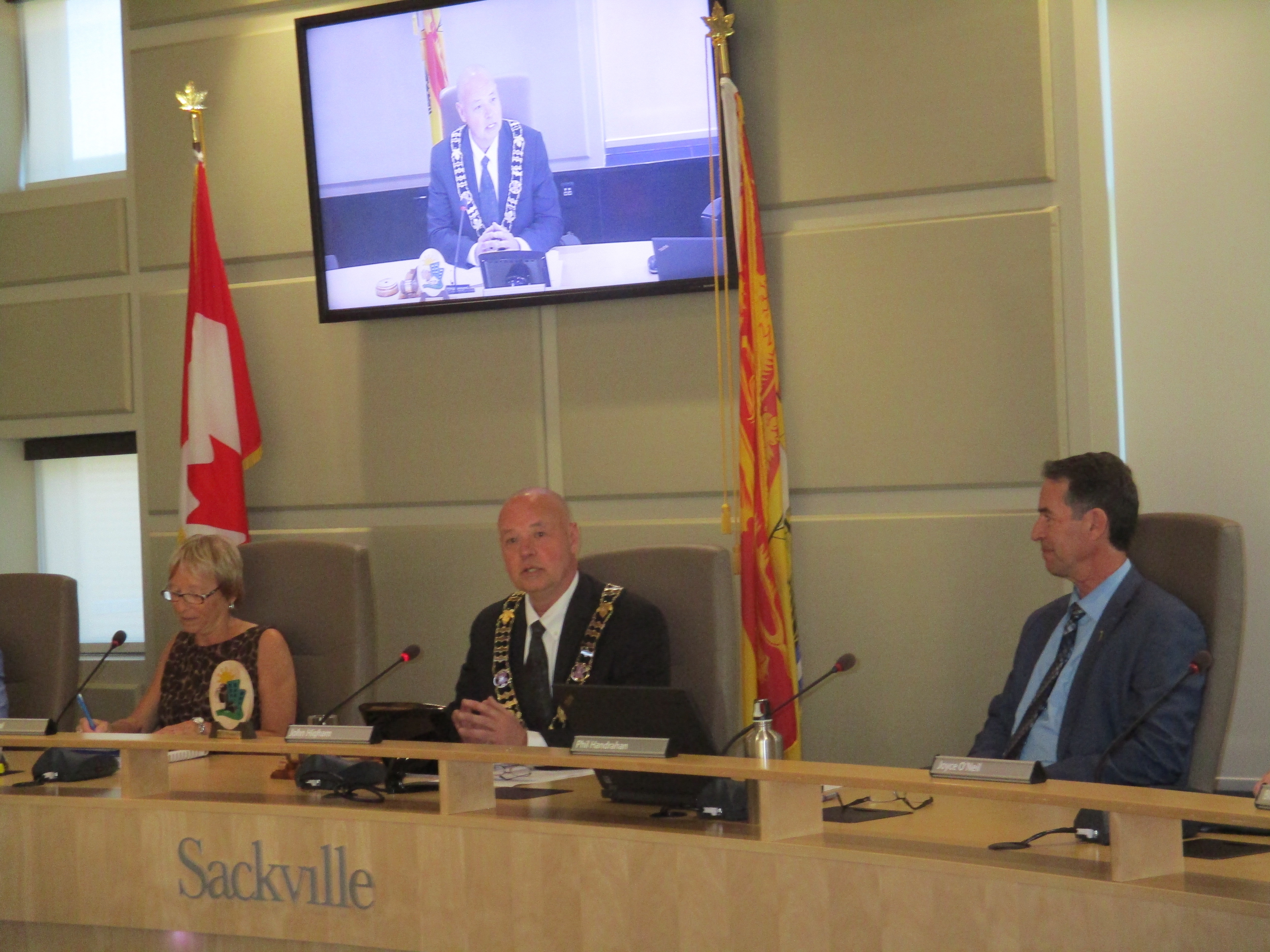 Mayor Higham (centre) presides at first Town Council meeting