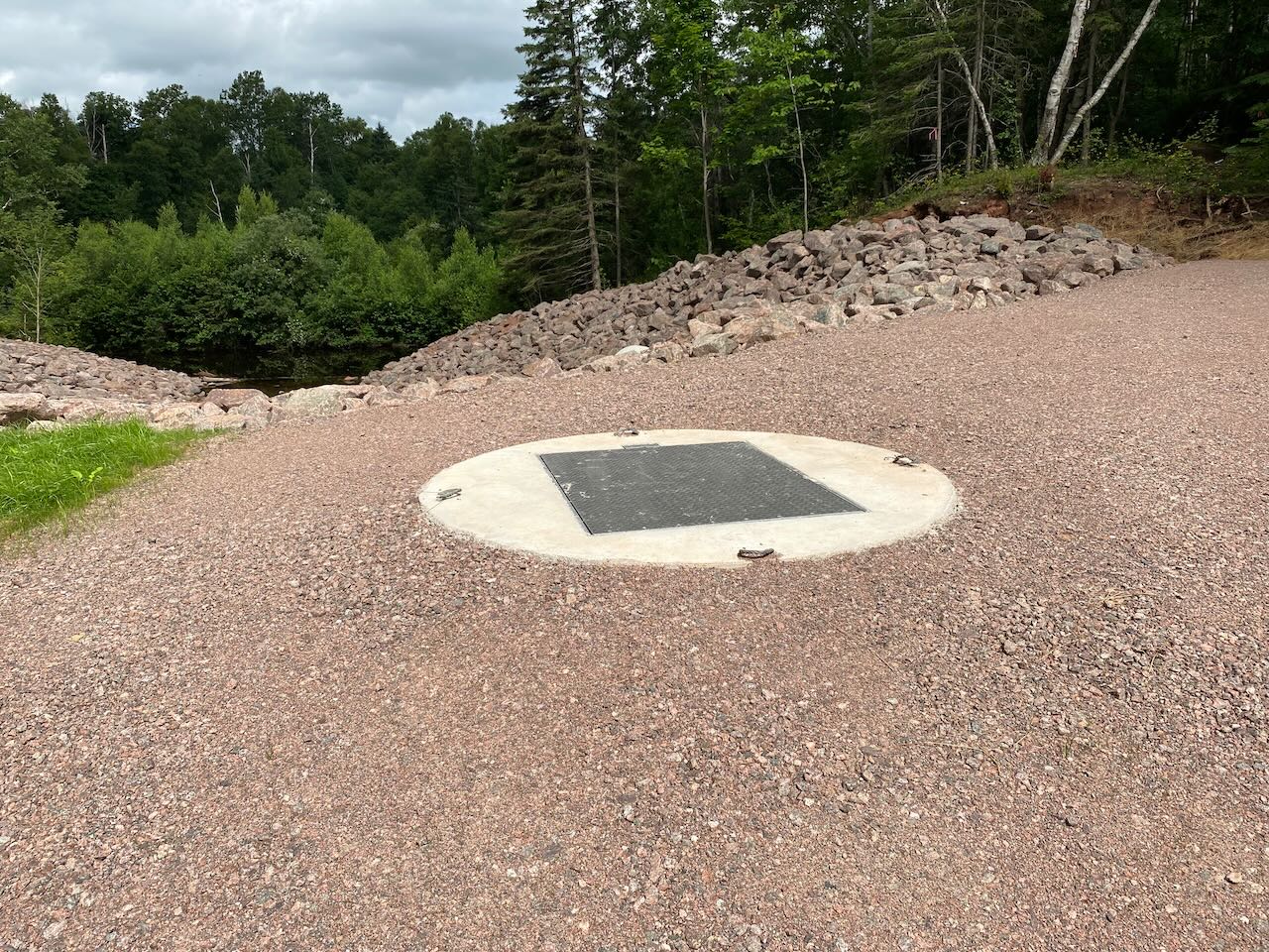 Photo shows top of the Pickard Quarry water control structure with retention pond at rear