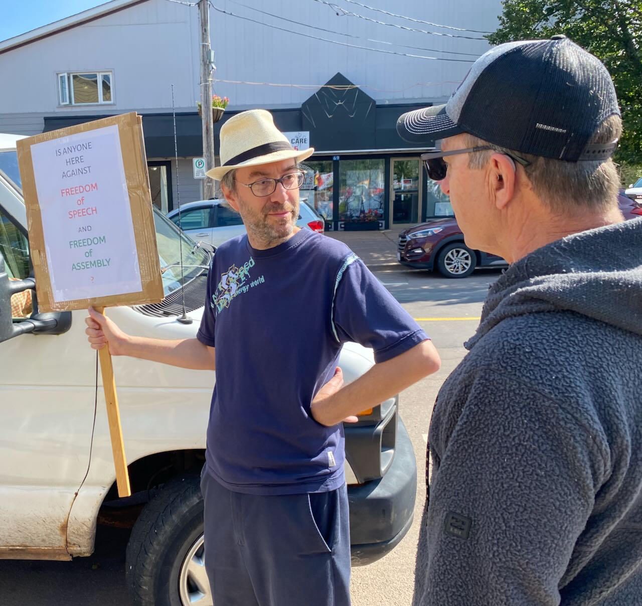 He and a fellow protester, who identified himself only as Terry Freedom, referred to COVID 19 and the restrictions that came with it as a “plan-demic.”