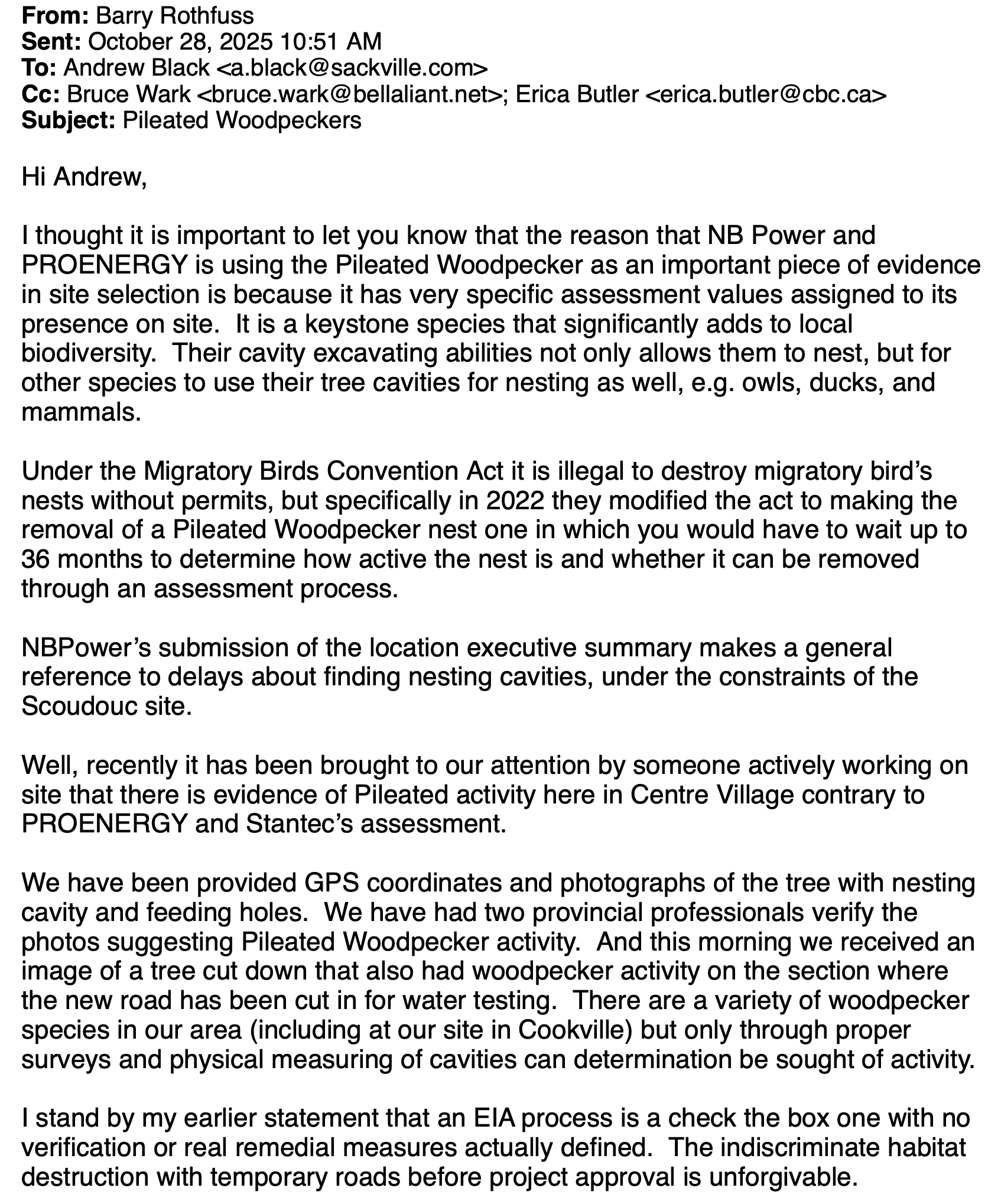 “Well, recently it has been brought to our attention by someone actively working on site that there is evidence of Pileated activity here in Centre Village contrary to PROENERGY and Stantec’s assessment,” Rothfuss writes in a letter he e-mailed yesterday to Tantramar Mayor Andrew Black.